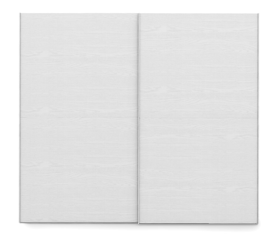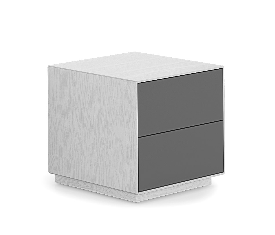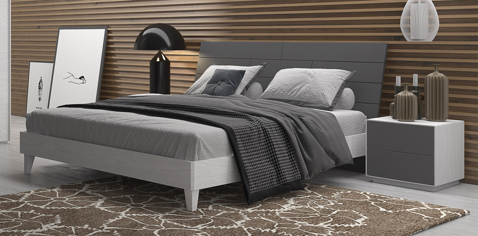 Consta de: armario con 2 puertas correderas, 2 mesitas de noche con dos cajones, cama. Presentados aquí en acabado fresno yeso y gris oscuro.