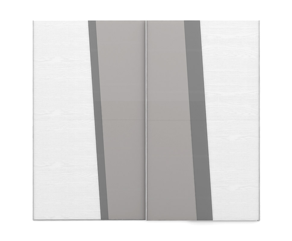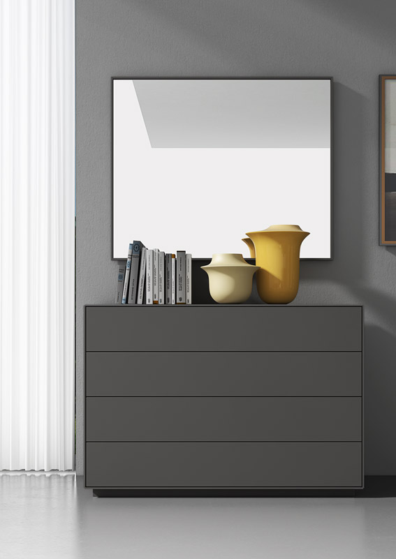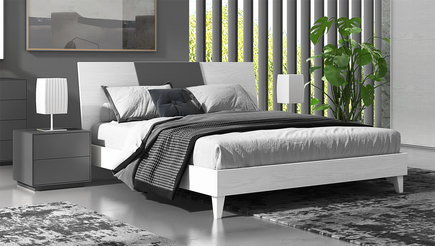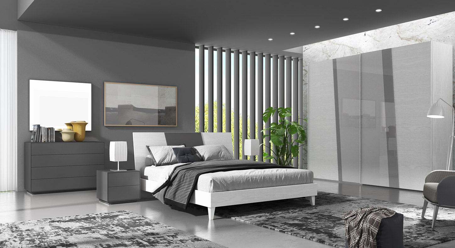Consta de: armario con 2 puertas correderas, 2 mesitas de noche con dos cajones, cómoda con cuatro cajones, cama y espejo. Presentados aquí en acabado fresno yeso y gris oscuro.