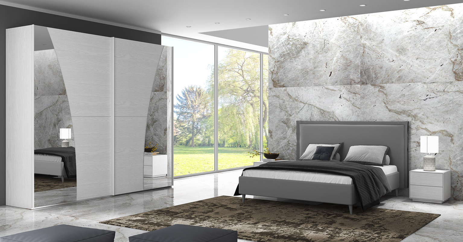 Compuesto por: armario de 2 puertas correderas con espejos, 2 mesitas de noche con dos cajones y cama tapizada. Aquí presentados en acabado fresno yeso.