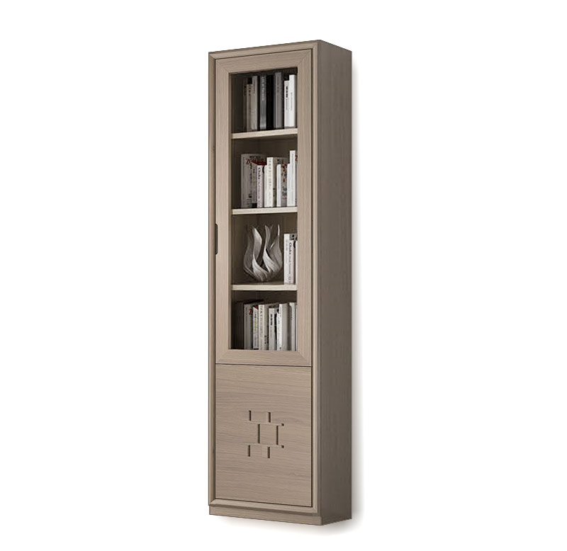 Hermosa librería en columna con puerta de vidrio en la parte superior y puerta de madera en la parte inferior.