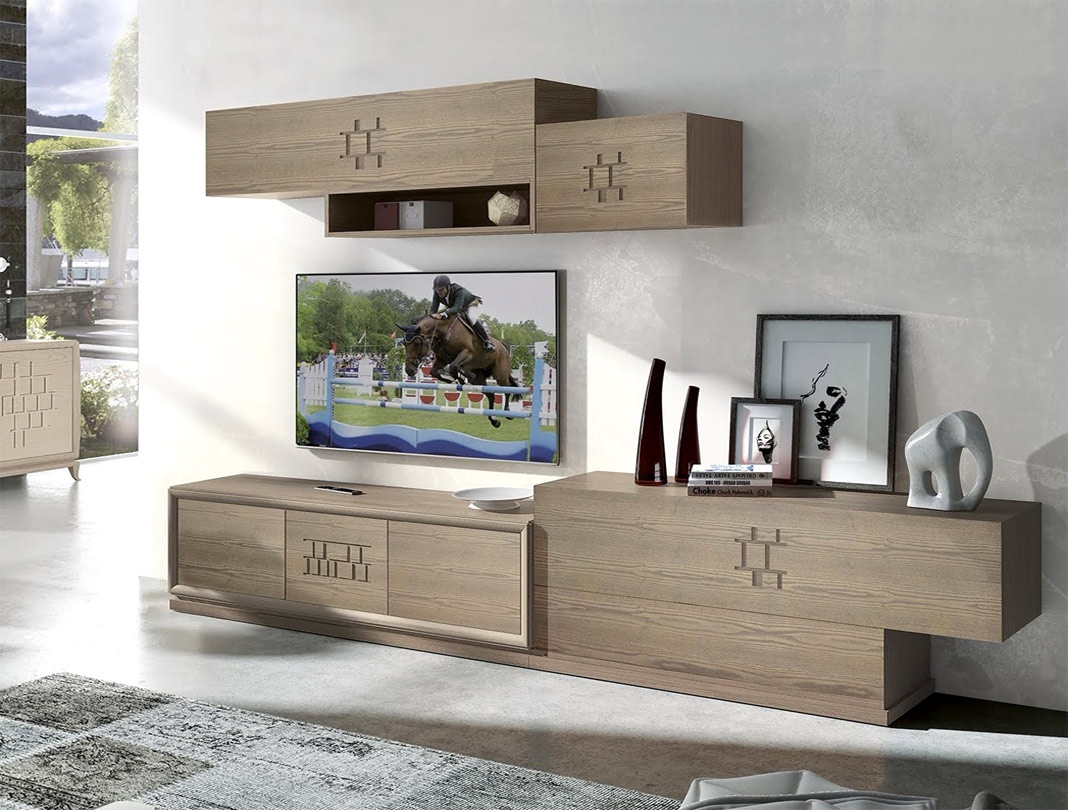 Otros dos muebles altos abatibles en la parte superior, uno de 150 cm con tallado y otro de 60 cm liso, combinados con un práctico mueble alto abierto, enmarcan de forma única y original el espacio para el televisor.