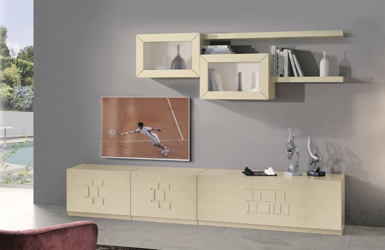 Luminosa composición de pared para TV de estilo contemporáneo en madera de fresno de alta calidad.