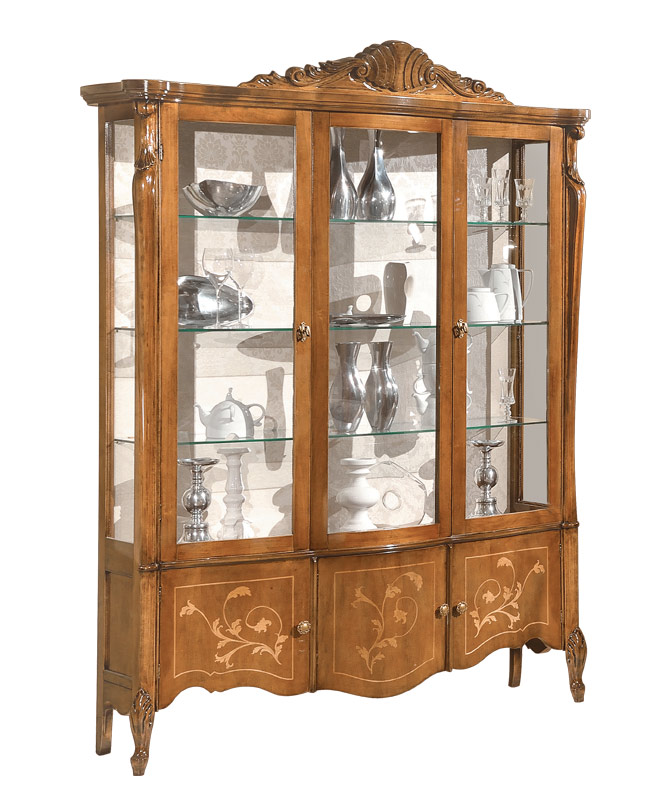 Majestuosa vitrina cristalera de estilo clásico, de línea ligeramente curvada y realzada por numerosos detalles tallados a lo largo de los laterales de las puertas y los pies. Un delicado intarsio caracteriza las tres puertas en la parte inferior, mientras que la parte superior se abre con cristal, también en los laterales, para dar un gran efecto de luminosidad al mueble y al ambiente en el que se coloque. Tres resistentes estantes de cristal dejan, también internamente, toda la luz y el espacio necesario para albergar los objetos más bellos de la casa.