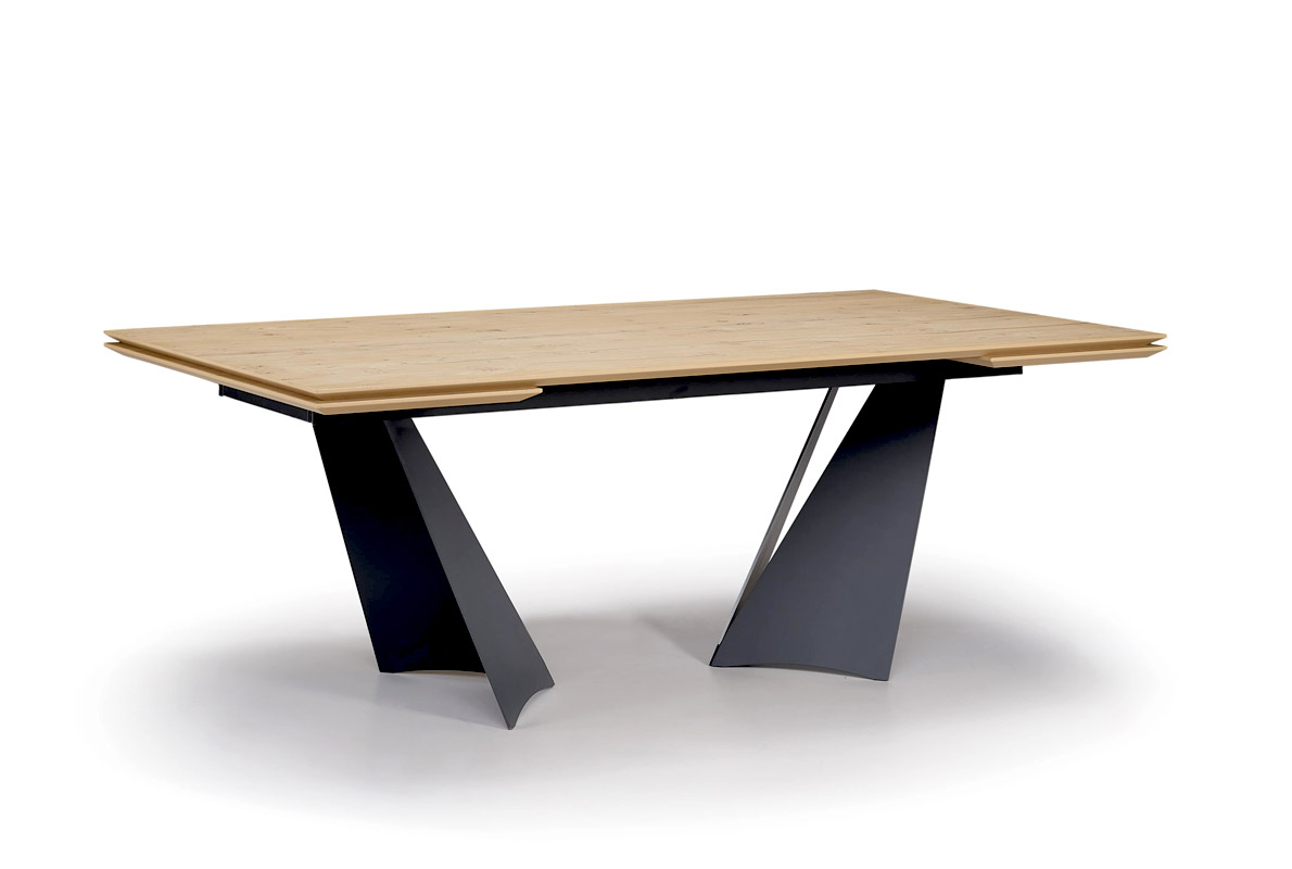 La particular base está compuesta por patas de hierro cortadas y moldeadas. Su base se apoya en el suelo en solo dos puntos para aportar ligereza y movimiento a toda la estructura de la mesa.