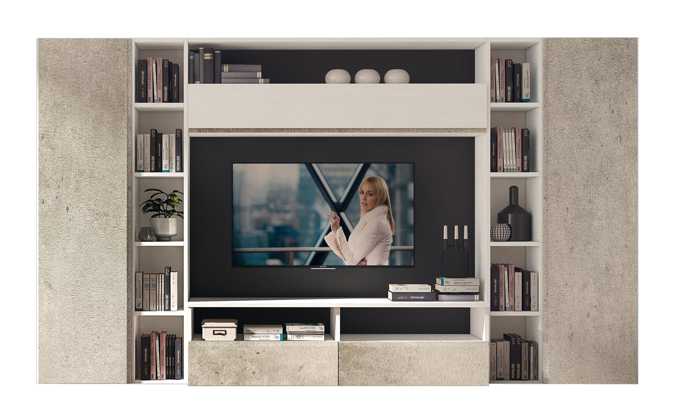 La unión entre el acabado de cemento y el fresno yeso crea una composición original y extremadamente moderna. Los espacios están bien organizados y son funcionales gracias a la alternancia de compartimentos abiertos y cerrados por puertas con bisagras amortiguadas. Los dos compartimentos laterales están equipados con 3 estantes internos regulables en varias alturas. Mueble de pared equipado con puertas y cajones con ranuras de tirador y bisagras y guías amortiguadas.