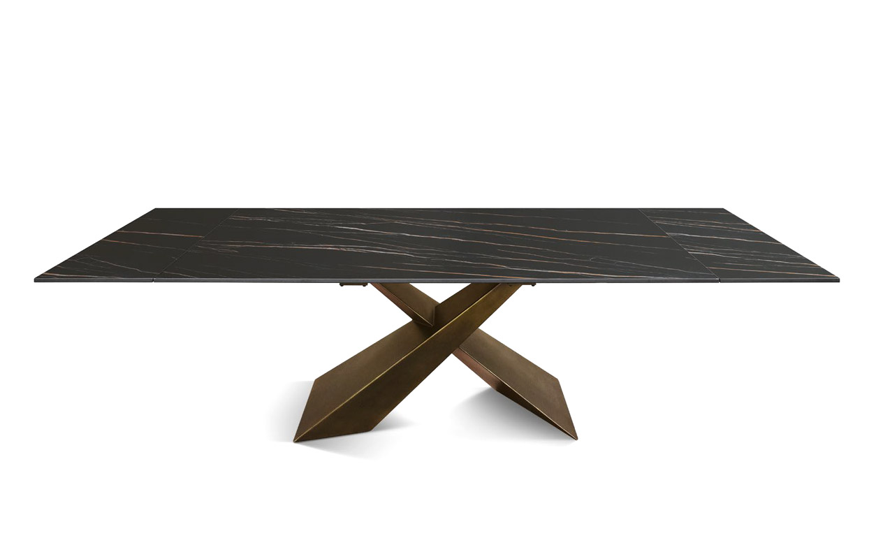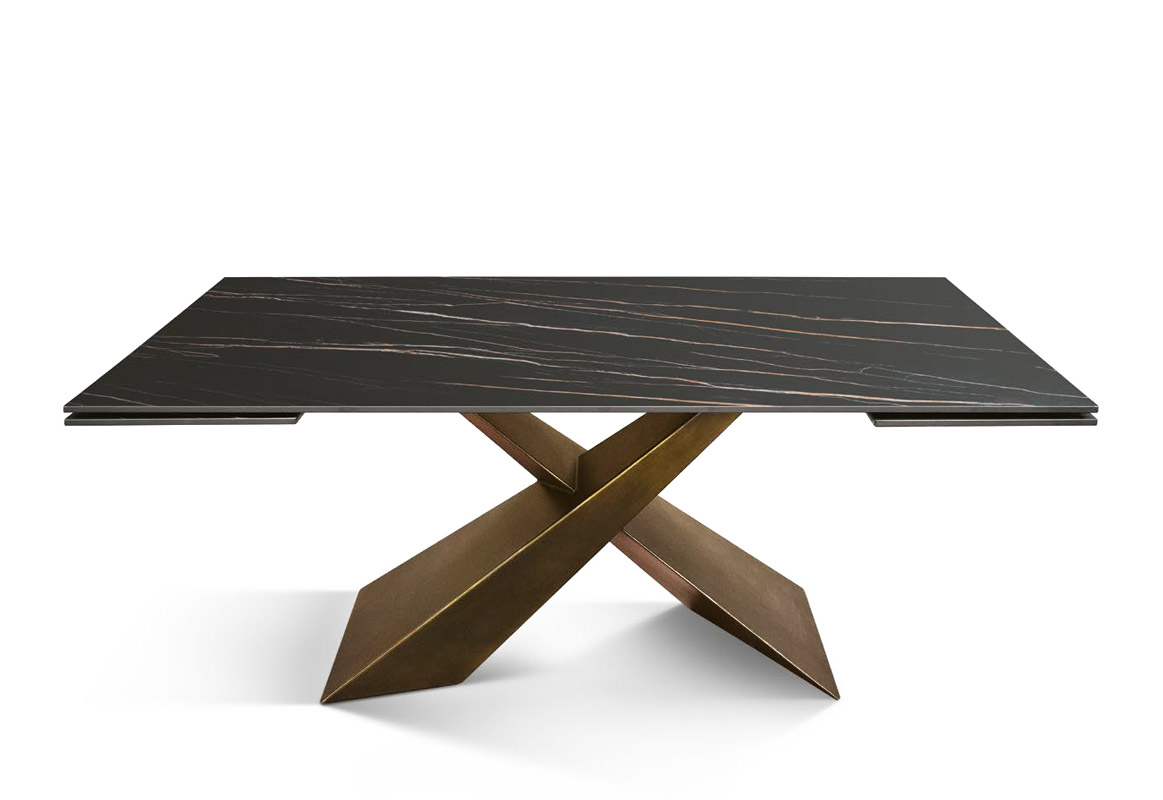 La base geométrica de hierro color bronce aumenta la preciosidad de esta mesa de estilo y diseño único en el mundo.