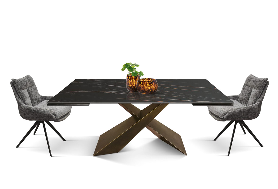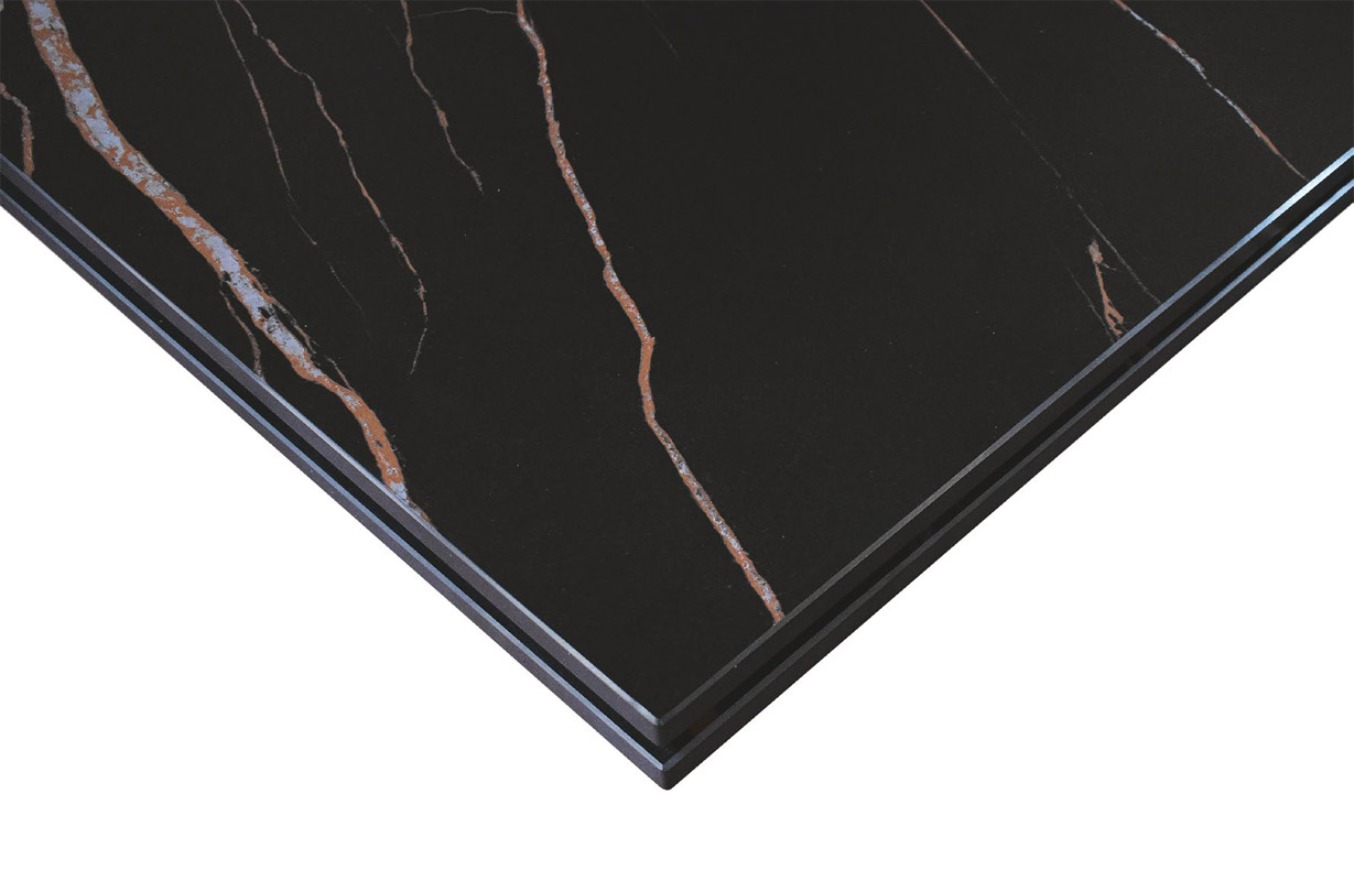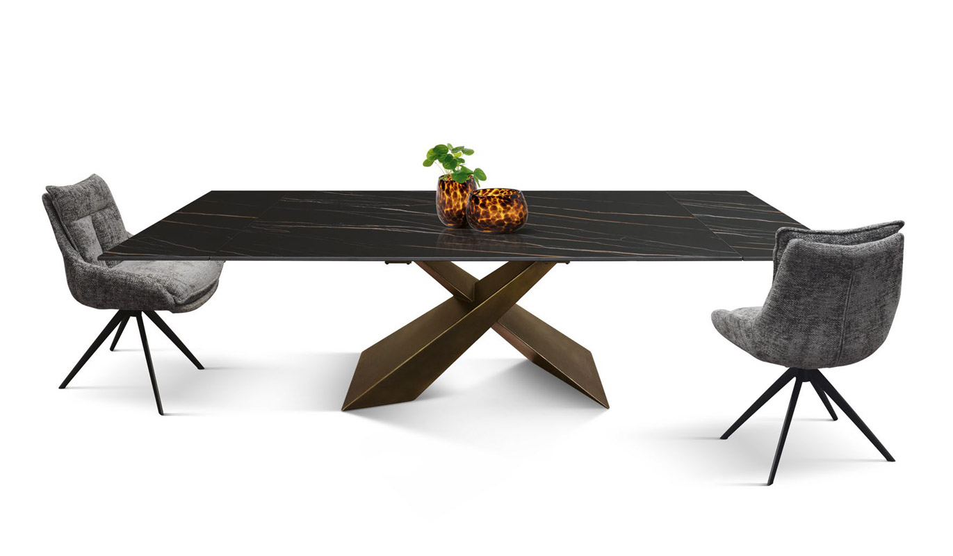 El tablero, de gran elegancia, está realizado en cerámica con efecto mármol negro veteado. Presenta dos cómodos extensibles, ideales para acoger a sus invitados durante las cenas de convivencia.