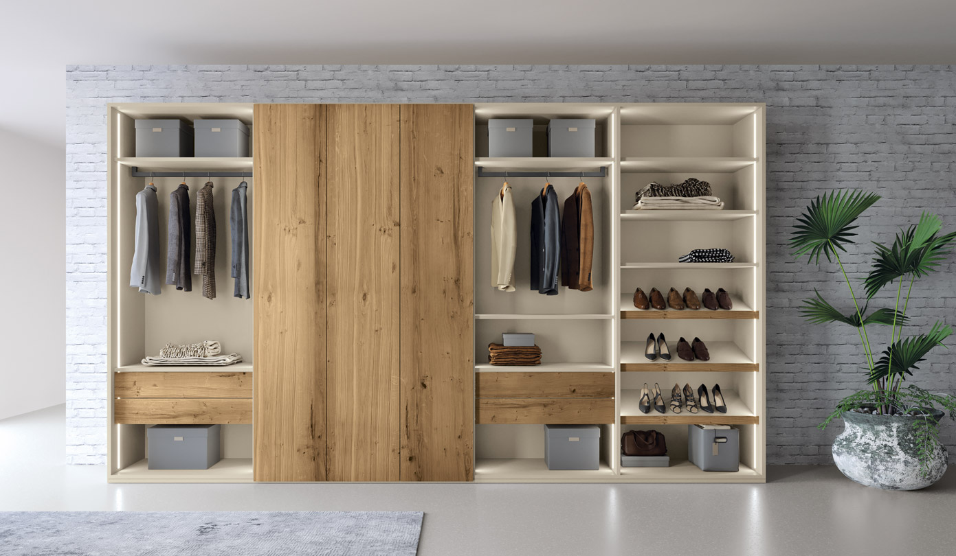 Armario modular abierto para un dormitorio de estilo moderno y contemporáneo.
