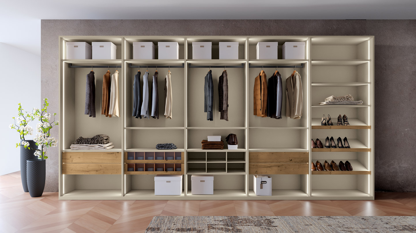 Los espacios están bien organizados para guardar la ropa de forma ordenada y fácilmente accesible: los compartimentos están completamente a la vista para mayor practicidad.