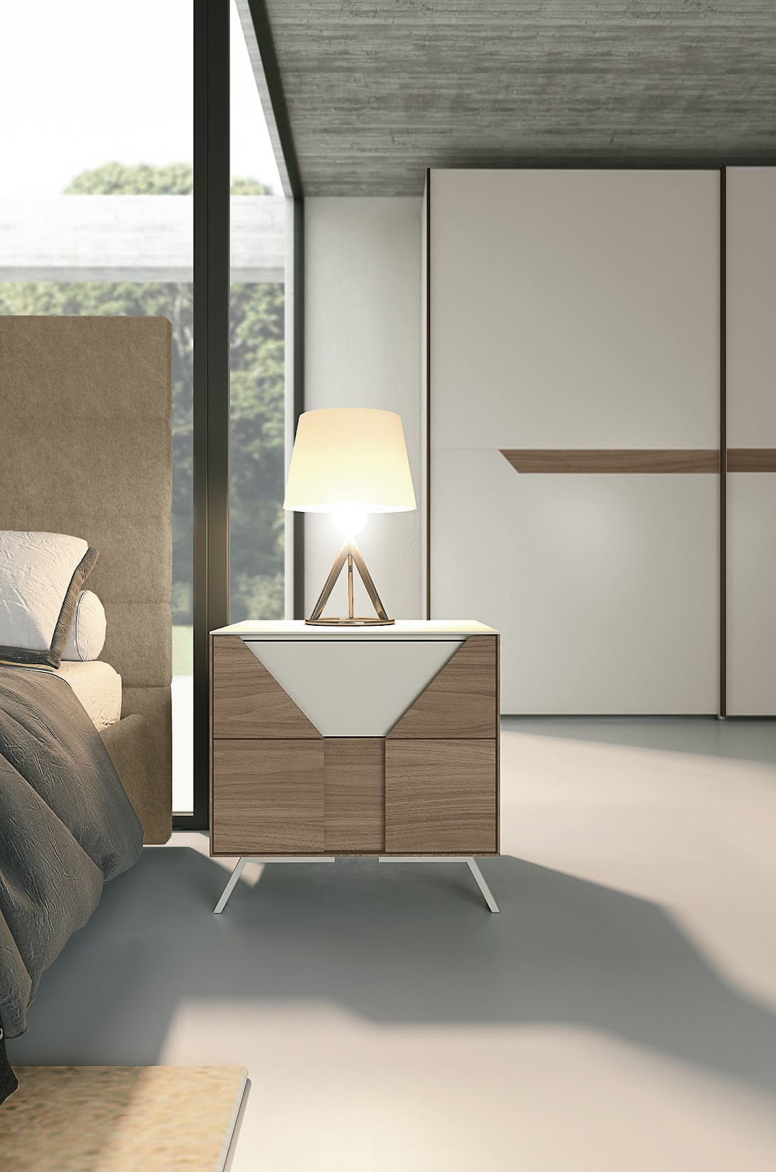 Completa la decoración de tu dormitorio con esta moderna mesilla de noche de dos cajones, ideal para combinar estilo y practicidad. Fabricada en aglomerado resistente, presenta dos chapados de melamina distintos que crean un llamativo contraste de acabados, añadiendo un toque de elegancia contemporánea.