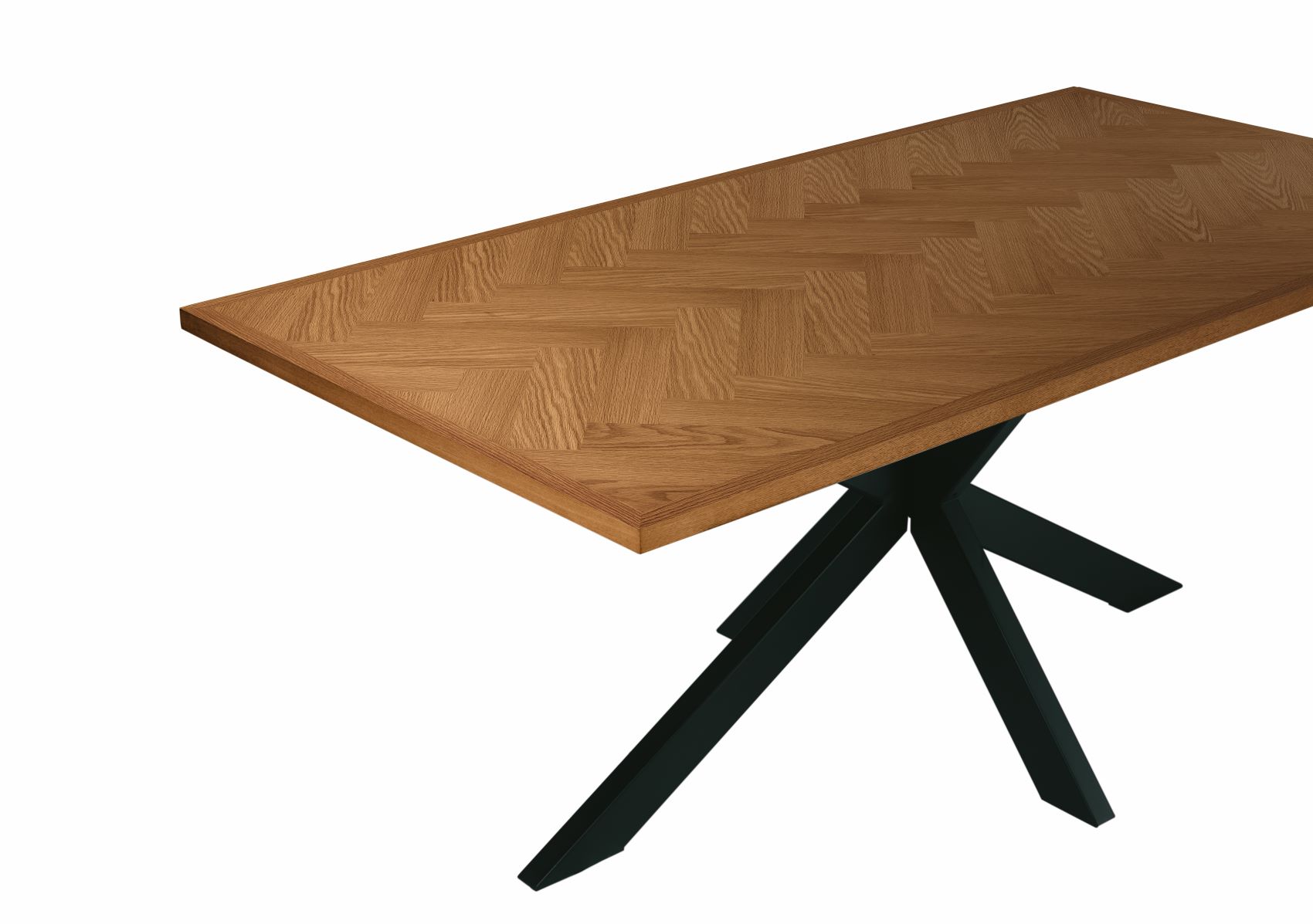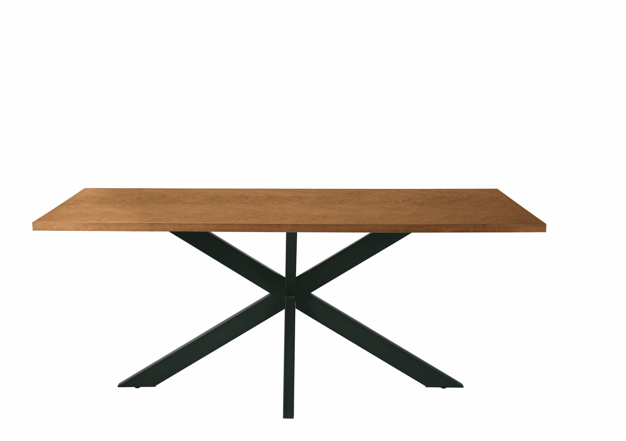 Tablero de roble natural con forma rectangular fija, estructura de hierro y base con patas cruzadas.