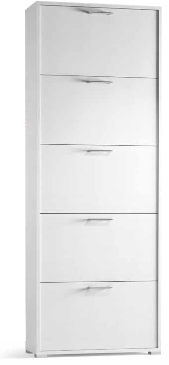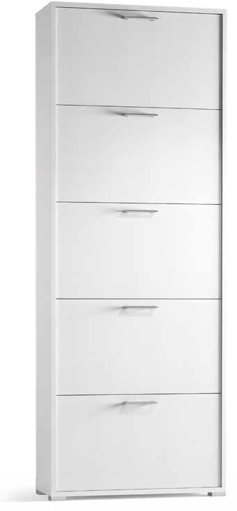 A la izquierda una larga puerta, con espejo exterior, que encierra un amplio espacio ideal para escobas y aspiradoras, por ejemplo. A la derecha, 3 puertas con solapa para los zapatos y, en la parte superior, una puerta encierra otro espacio para guardar otros objetos útiles.