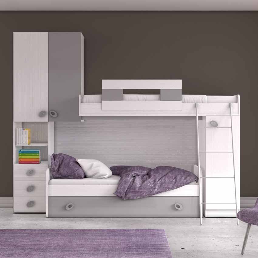 Un refugio mágico donde los sueños se hacen realidad. Nuestro dormitorio tipo loft, con sus bases de láminas que prometen noches estrelladas y la estructura de fresno blanco que ilumina el espacio, es el lugar perfecto para dar rienda suelta a tu imaginación. Los frentes de fresno gris claro y blanco crean un ambiente sereno y acogedor, listo para recibir cualquier aventura.