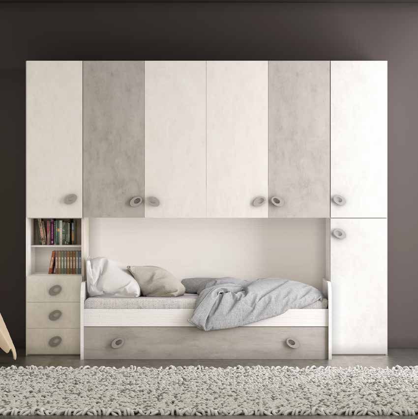 Original dormitorio estilo bridge, con una estructura envolvente de fresno blanco y frentes de puertas y cajones que evocan la solidez del cemento y la serenidad de Atenea. Dos somieres, uno de láminas para sueños ligeros y otro de punto para aventuras sin fin, acompañarán a los niños en un mundo de fantasía y descanso.