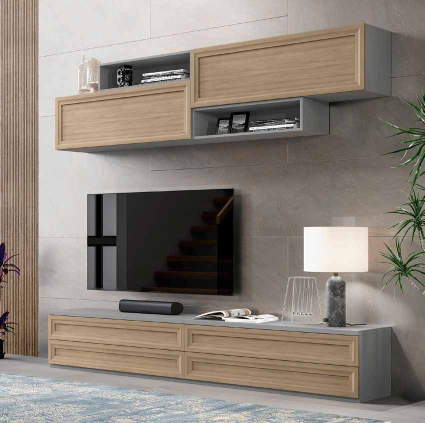 El marco gris perla aporta una elegancia discreta, mientras que los frentes de puerta enmarcados en nogal siena añaden un toque de calidez y naturalidad. Este contraste de colores y materiales hace que el salón sea versátil y se adapte a diferentes estilos de decoración.