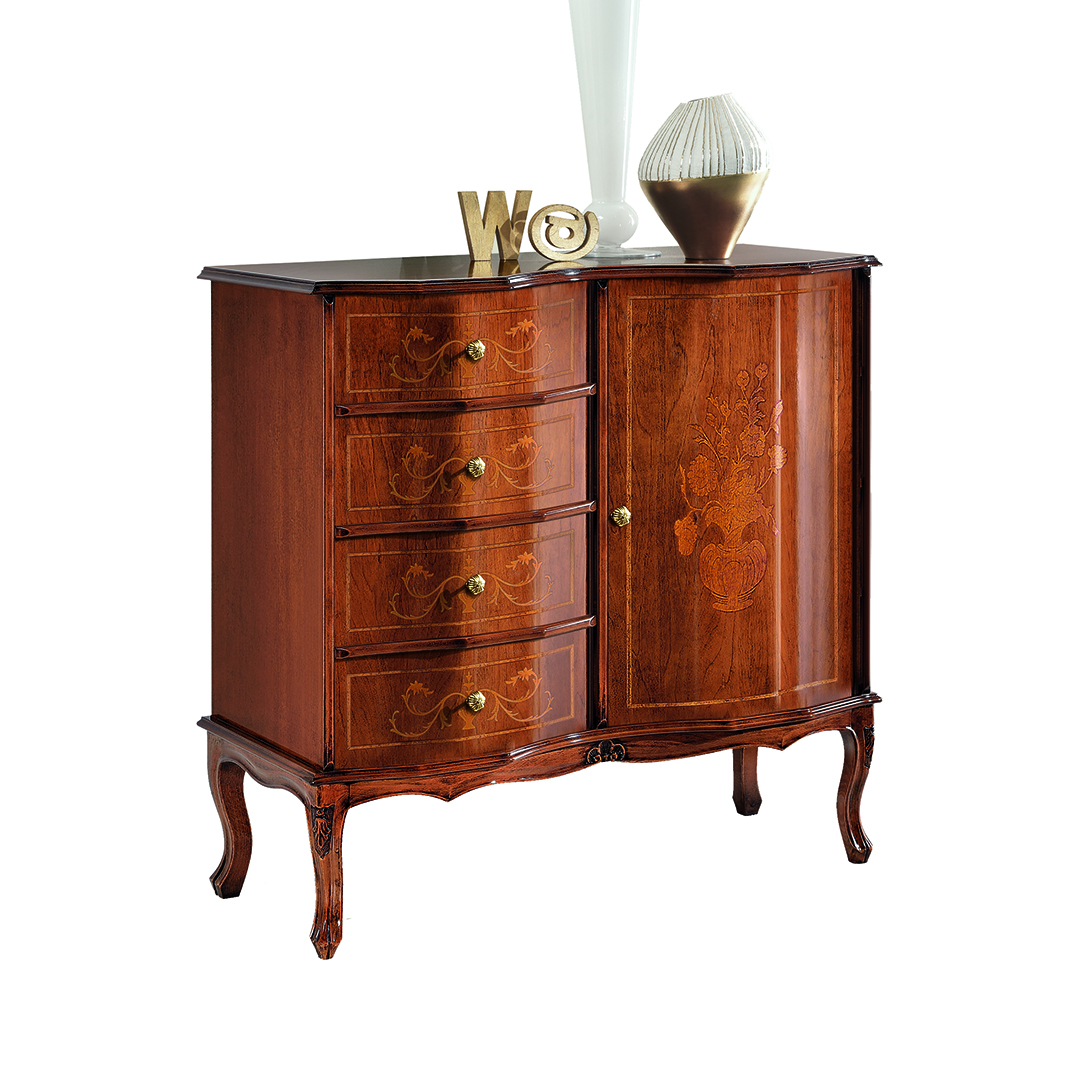Los cajones y la puerta, adornados con delicadas incrustaciones, ofrecen gran capacidad y espacio, creando un bello juego de líneas y formas.