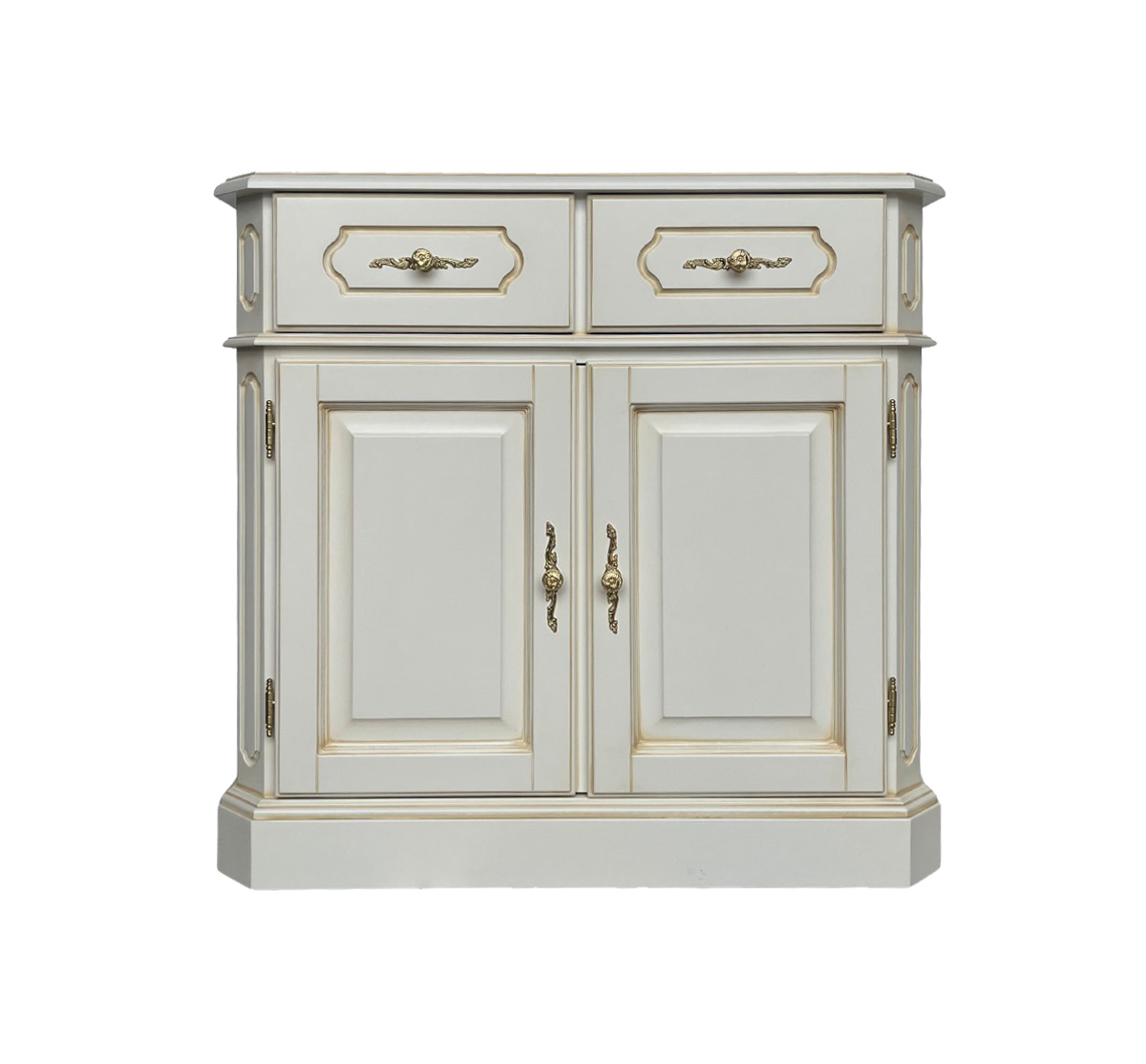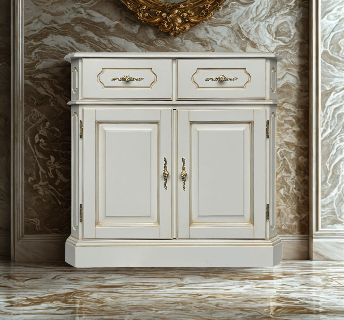 Splendida credenza con specchiera: composizione per un ambiente raffinato che, grazie a questo splendido elemento d'arredo, sarà valorizzato al massimo.La credenza modello MT-62 è decorata con foglia oro su raffinata laccatura bianca. In abbinamento, a rendere maestosa la composizione, la splendida specchiera dalla forma elegante e classica, anch'essa valorizzata nelle parti intagliate, dall'applicazione della foglia oro.L'espressione massima dello stile e della classicità è rappresentata al meglio da questa composizione credenza con specchiera. Il suo valore è decisamente elevato e soltanto la vendita diretta da noi attuata permette questo prezzo, introvabile altrove per un prodotto di tale qualità.Dimensione specchiera- Esterne H130 x L152 cm spessore 8 cm- Misura effettiva solo specchio cm 131 x h96Dimensioni credenza: - Totali L177 x P57,8 x H91,3 cm- Cassetto capacità cm L47 x P42 x H11,4 (L esterna cm 49,7)- Dimensioni ante esterne cm L49,3 x H60,2- Dimensioni anta centrale cm L49,7 x H44,5