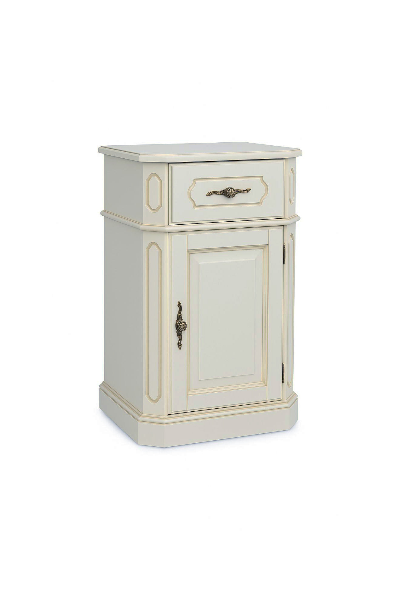 El espacioso cajón y la puerta están adornados con pomos trabajados.