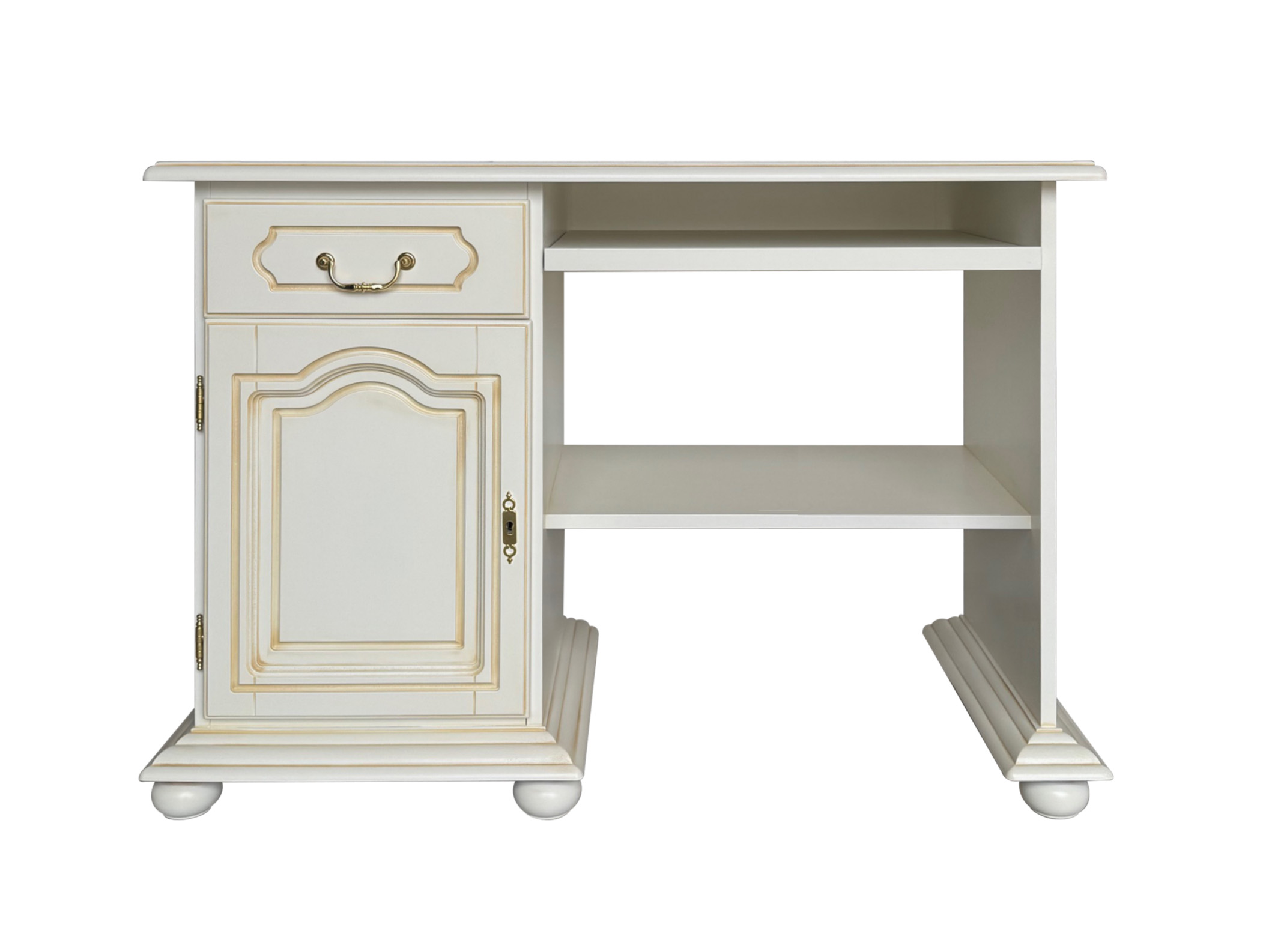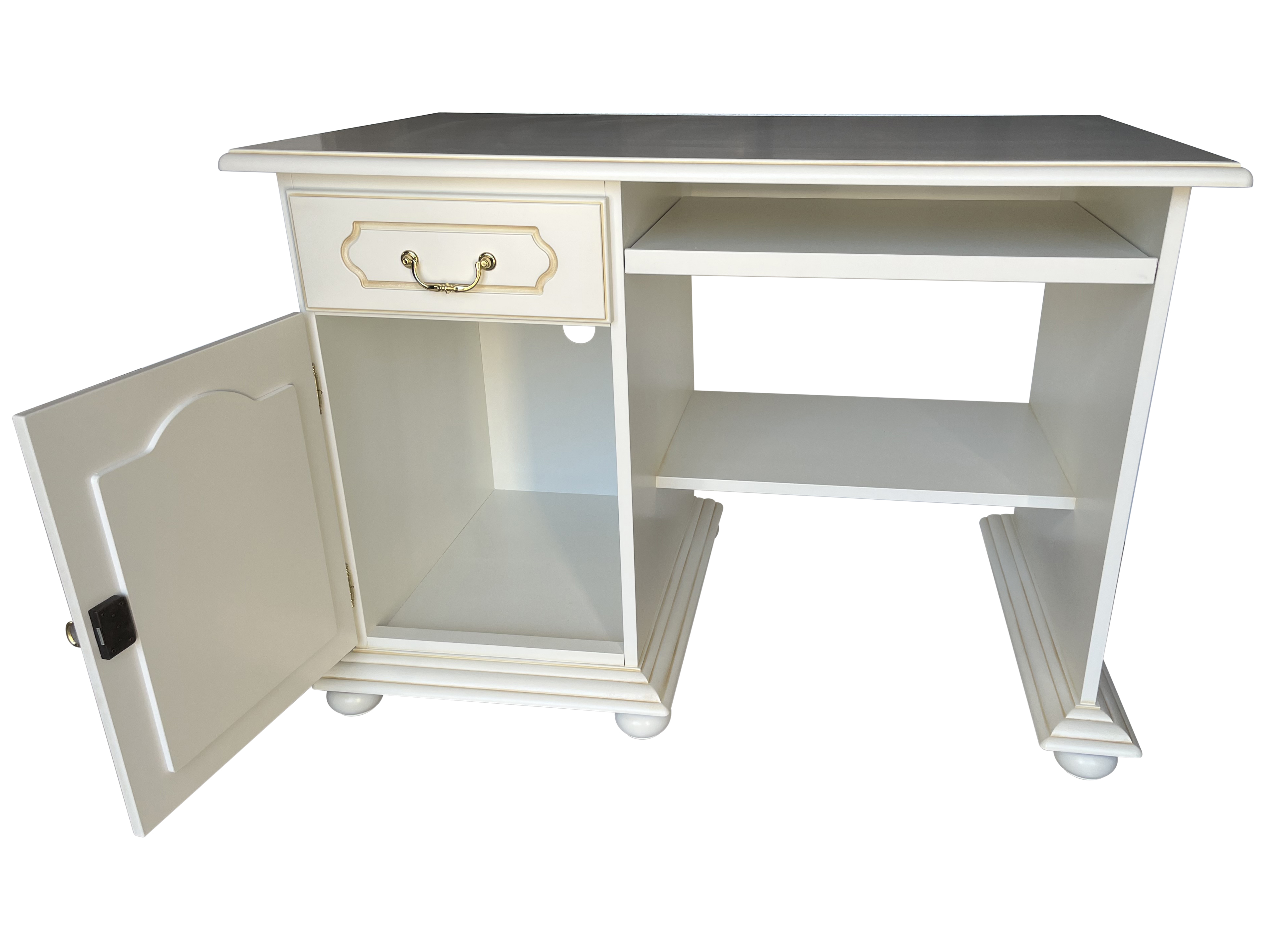 El escritorio cuenta con una bonita superficie de apoyo de 110 cm, un cajón a la izquierda, encima de la puerta de madera, y otra superficie de apoyo abierta para otros equipos útiles.