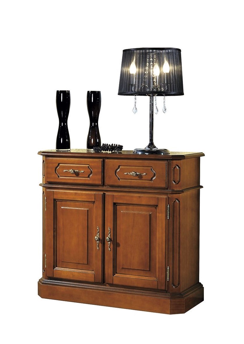 Aparador con 2 puertas y 2 cajones de estilo clásico, donde la esencia de la madera se realza gracias al pulido artesanal.
