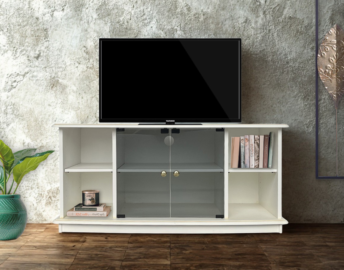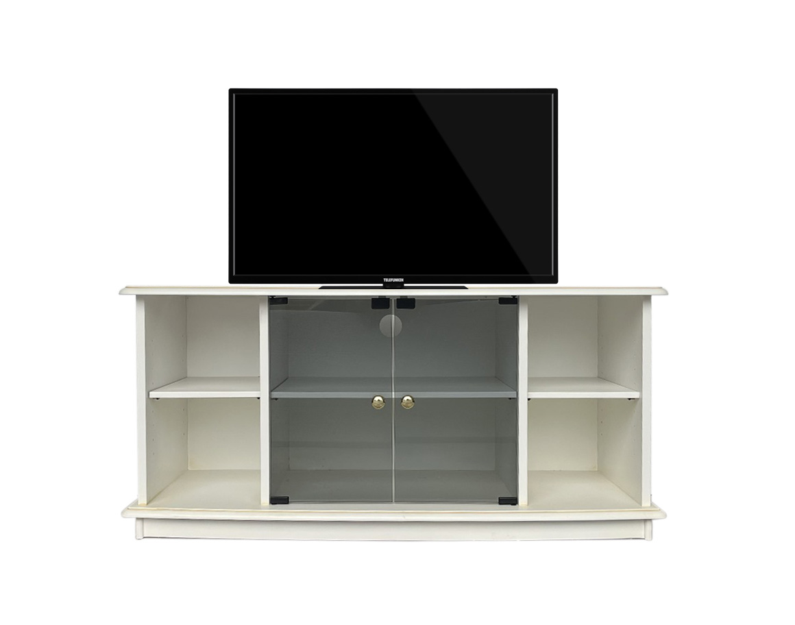 Precioso mueble para TV de estilo clásico pero con detalles modernos, como las puertas centrales de cristal ahumado con cierre magnético y las líneas suavizadas del zócalo y la tapa.