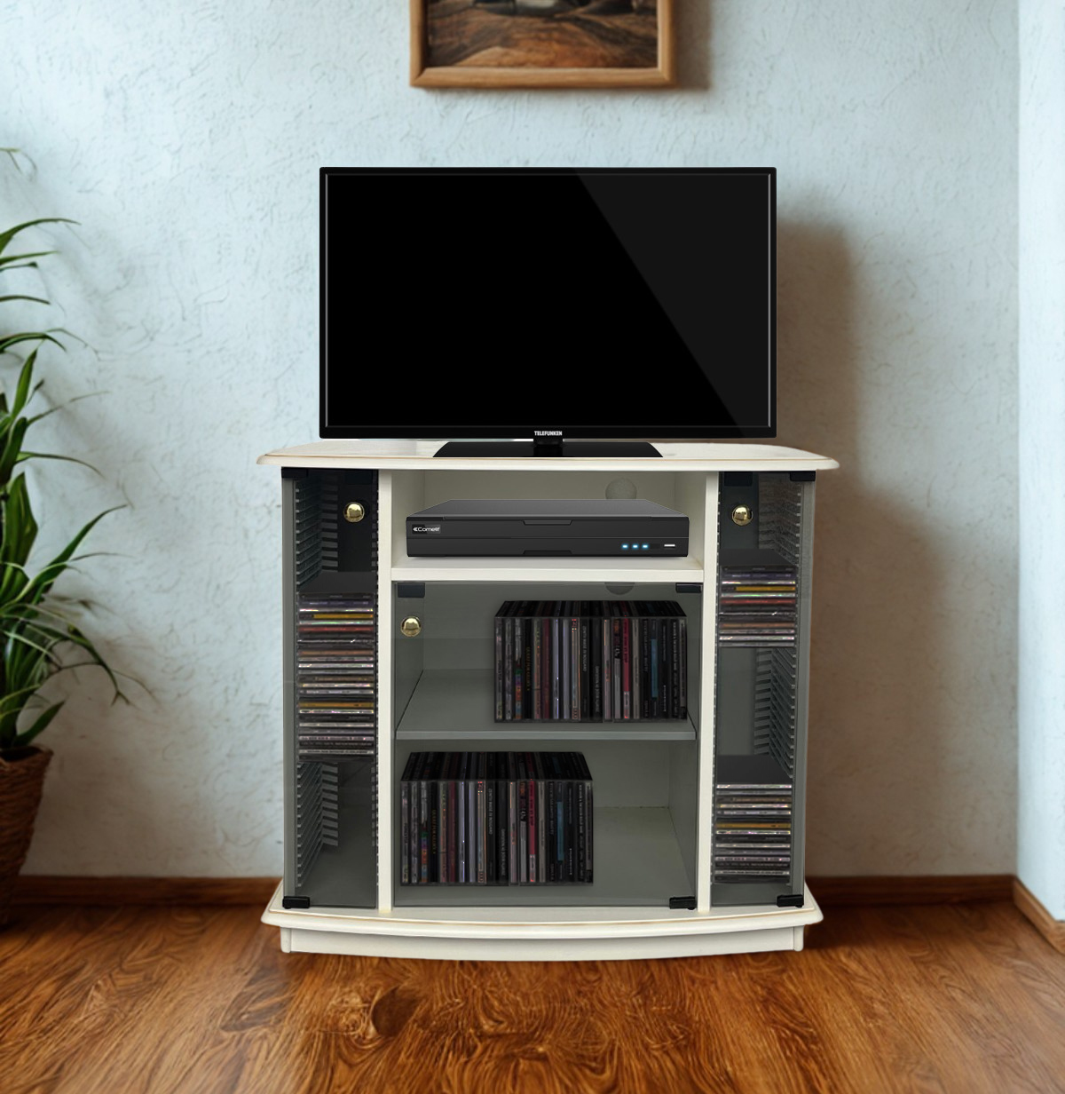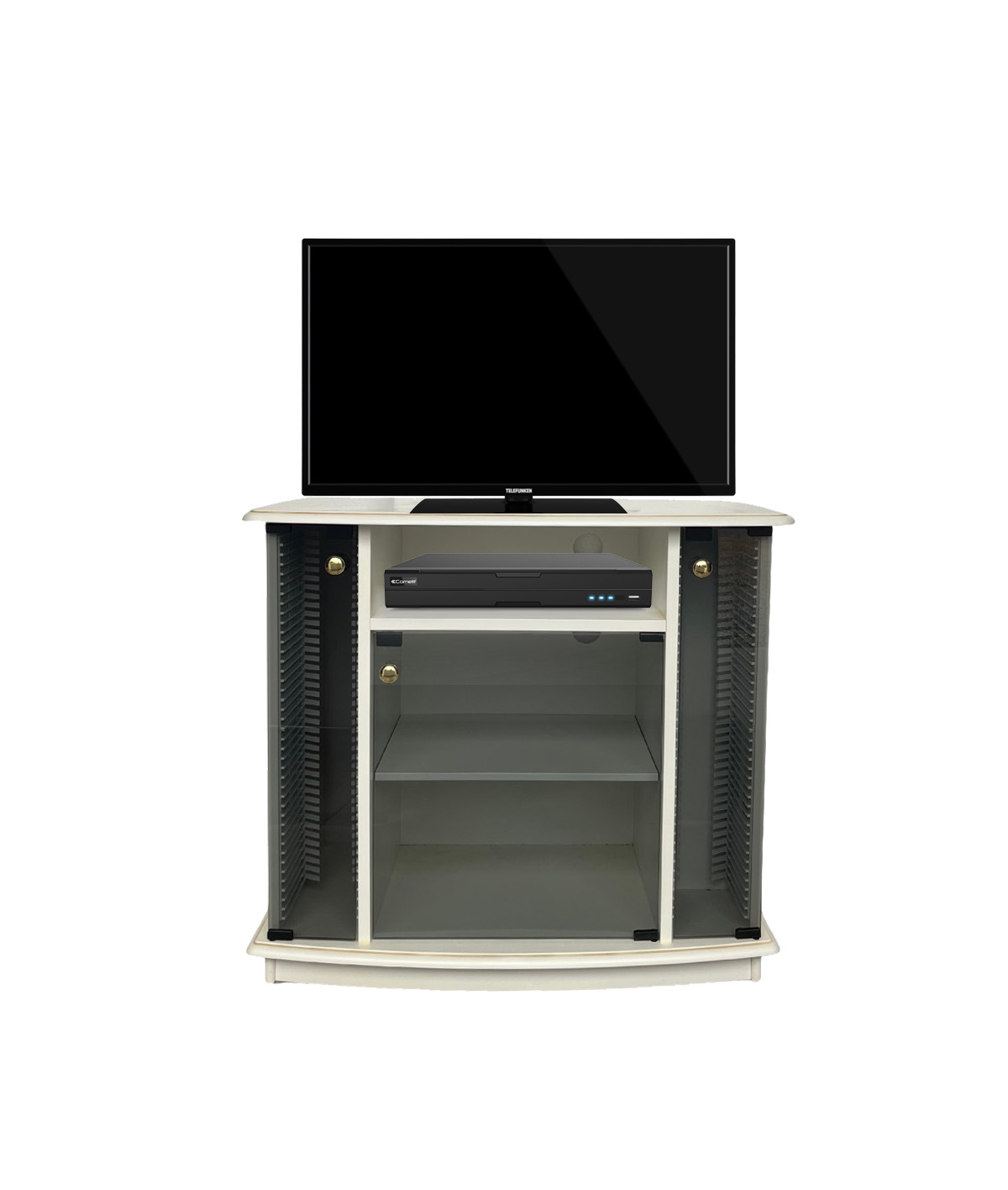 Un mueble para TV y CD atemporal, con numerosos compartimentos para colocar aparatos, libros, revistas y CD (las dos columnas laterales están equipadas con una rejilla para 40 CD cada una, para garantizar el orden).